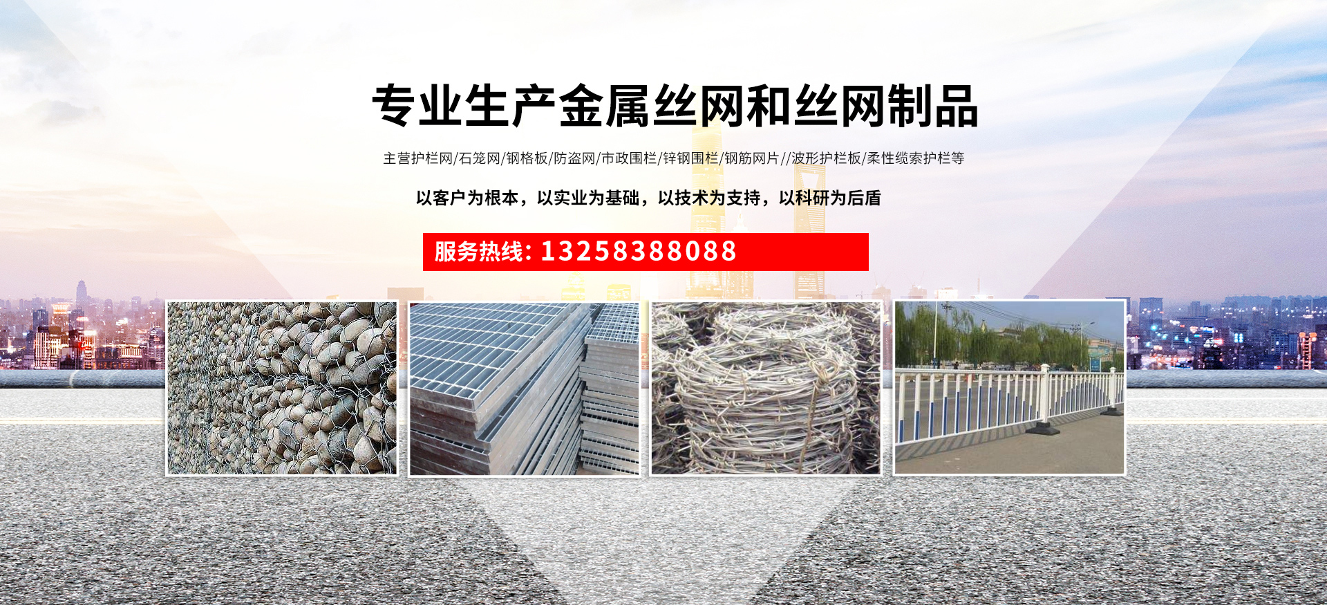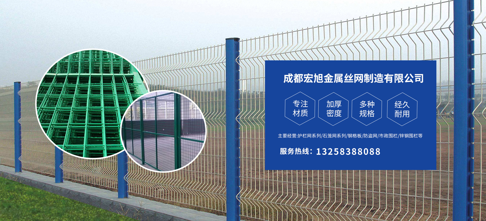 成都宏旭金屬絲網(wǎng)制造有限公司主營(yíng)護(hù)欄網(wǎng)系列、石籠網(wǎng)系列、鋼格板、防盜網(wǎng)、市政圍欄、鋅鋼圍欄、鋼筋網(wǎng)片、聲屏障系列、波形護(hù)欄板、柔性纜索護(hù)欄、SNS邊坡防護(hù)網(wǎng)等其他絲網(wǎng)類(lèi)產(chǎn)品。特殊規(guī)格可加工定做,也可根據(jù)客戶來(lái)圖來(lái)樣定做。自創(chuàng)業(yè)以來(lái),公司一直堅(jiān)持市場(chǎng)為導(dǎo)向,以客戶為根本,以實(shí)業(yè)為基礎(chǔ),以技術(shù)為支持,以科研為后盾,集科研、生產(chǎn)、經(jīng)營(yíng)為一體,不斷研制開(kāi)發(fā)新產(chǎn)品,開(kāi)拓市場(chǎng),走綜合發(fā)展之路。多年來(lái),公司憑借過(guò)硬的質(zhì)量,良好的信譽(yù)、優(yōu)質(zhì)的服務(wù)、合理的價(jià)格,贏得了市場(chǎng)和商家的一致好評(píng)。